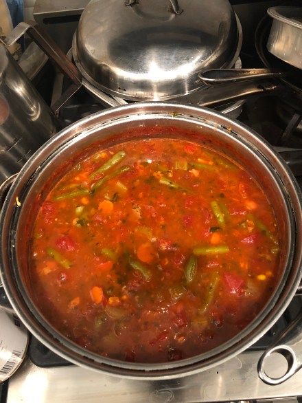 Anyway, I softened the garlic, onions, celery and carrots first, along with the tomato and anchovy paste (first go of salt and the Maras pepper at this point, but I added more later), then added the potatoes (sliced pretty small), then bell peppers and then you can deglaze the pot with the wine or vermouth; I keep vermouth for cooking as a wine alternative. This assumes you are using frozen or canned corn and green beans – if fresh you would want to add them before deglazing.