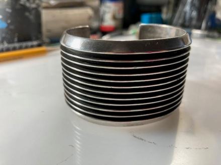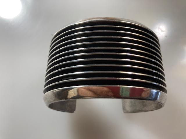 Among several pieces and most beloved is this silver cuff. I myself wear a lot of gold and this had been put away for awhile when I rediscovered it about five years ago. It is remarkably comfortable despite being hefty. My father used to purchase such pieces from a small gallery/shop neat Grand Central in a high rise with a public atrium and stores. The Whitney Museum had a space there for years. I wear this cuff very frequently – or at last did pre-pandemic, dressing for work.