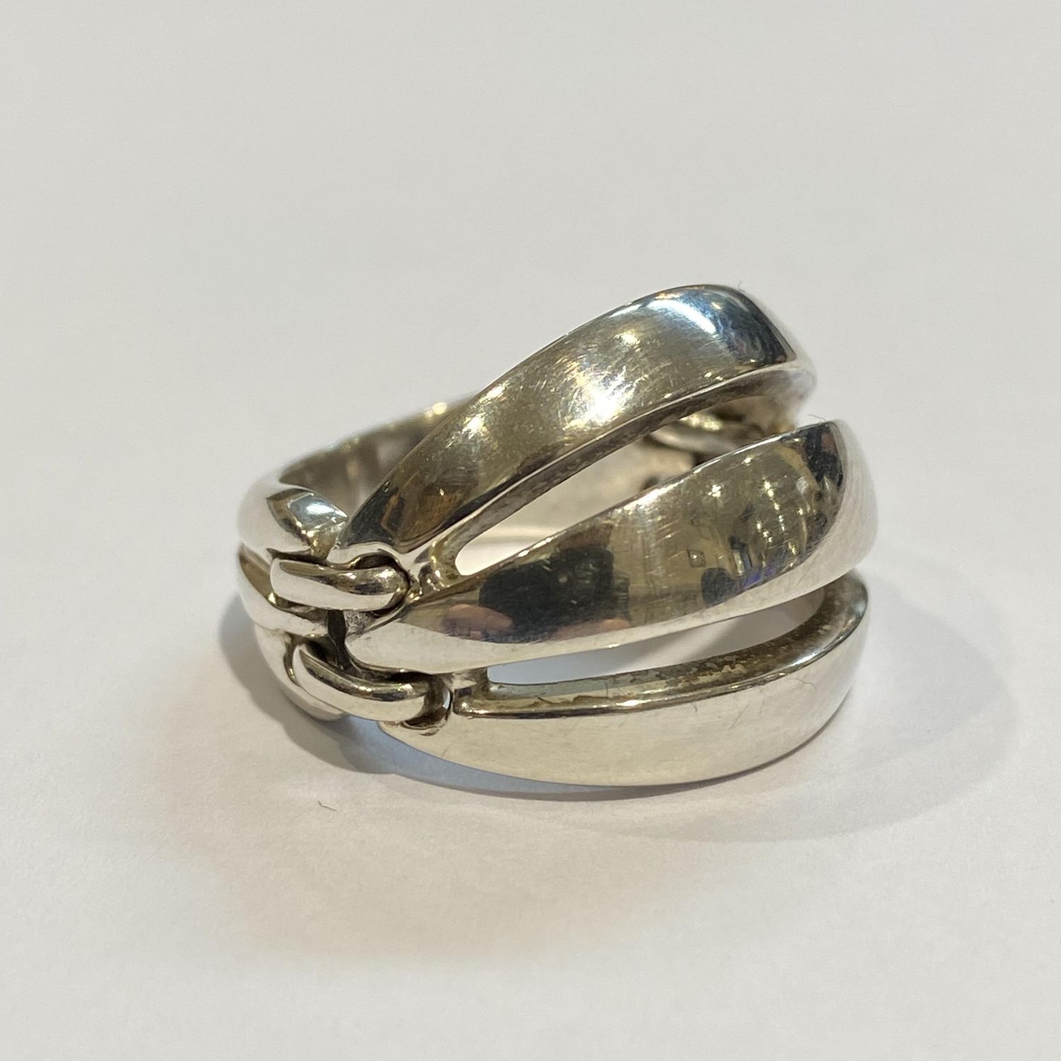 Turns out the ring was a vintage one from the silver company of George Jensen, a Danish silversmith (1866-1935) whose designs my father loved with all of it. My father had a great eye and decided taste running toward Brutalist and modernist design in jewelry. He vastly preferred silver to gold and other than a good watch I cannot think of a piece of jewelry he gave me that wasn’t silver. (He loved silver in all things though and would buy sterling anything with impunity, wherever he found it. As a result silver services piled up in the house too over time.) He was not partial to gem stones liked his silver largely unadorned. (Meanwhile, I’m not sure who considers ring buying while recovering from broken fingers. I can hear my father saying, Well, that’s what you get for exercising!) His taste was consistently clean and simple lines in all things – from Shaker furniture to suits.