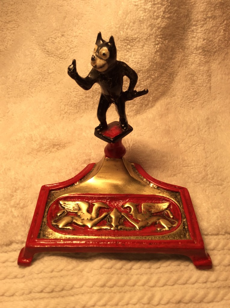 Felix was popular with bridge players and I have seen other such interesting items related to the game, bid on and lost them previously. This Felix has a distinctly British look to him although he came to me from a US dealer. The design leads me to think he was made by Pixyland Kew (in the 1920’s they would have been Pixyland and Kew before they merged) as he has that look. As you can see, it appears they plunked this ready-made little fellow onto this base. (I wrote about my Felix Pixyland Kew figures once before and the history of that company. That post can be found here and another can be found here. Lastly, I have also done a post about the Felix Bridge tally card below which can be found here.)
