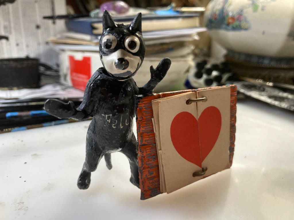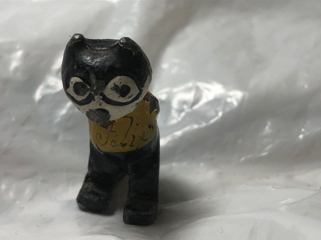 Pam’s Pictorama Post: As a devoted collector of Felix related objects I focus largely on the off-model, the unlicensed and often more singular, odd objects. These rarified bits often go for substantial money and as often as not I do not manage to acquire them. Sometimes fate allows one to fall into my hands and I put this one in that category.