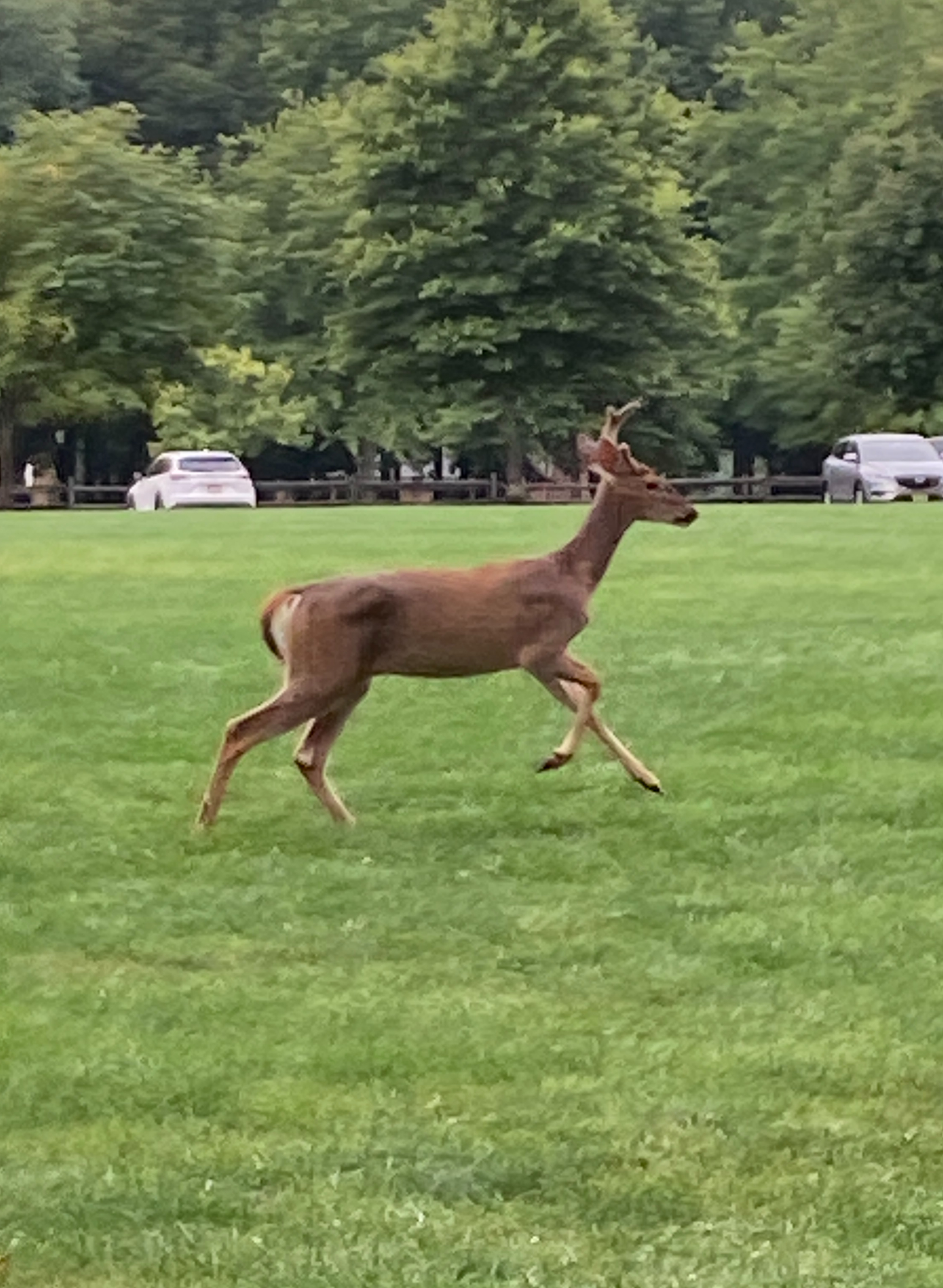 I continued on, up toward some additional community playing fields boardering on a heavily wooded area which I believe is responsible in part for the diversity of birds my mom enjoys in her tiny yard – including hawks and, surprisingly, turkey vultures. As I approached the field I saw unleashed dogs playing and was hesitant to run through – however as I got closer I realized they were instead young deer romping. I jogged the perimeter of the field and noted a nice community garden with someone just beginning his work there, along one side.