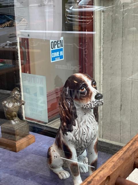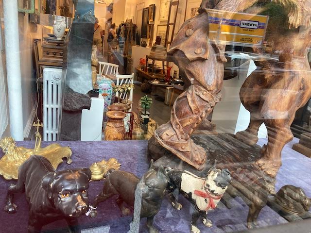 Although I’m unsure if we even went in again, I liked to look in the window. A few months back in February they had vintage newspaper dresses in the window which entertained me. And recently they launched a display of dog banks and door stops which garnered my attention. First one (nice!) cast iron door stop, but rapidly filled in with the others. Banks followed, a barking dog bank which made us curious about what the action might be. Now they had my full attention, wondering each Friday if there would be another addition – or would something have been sold and disappeared?