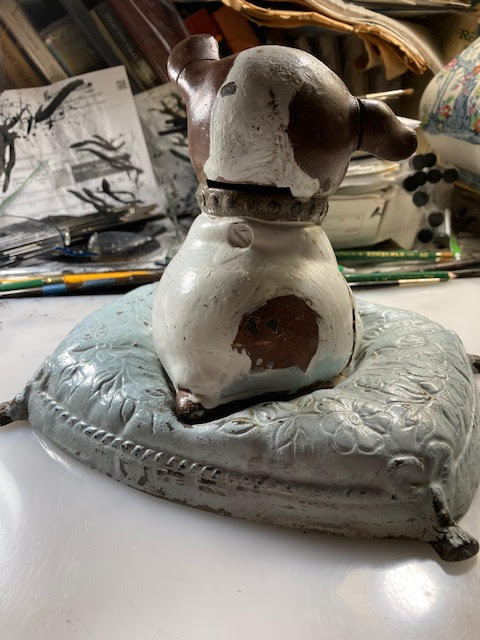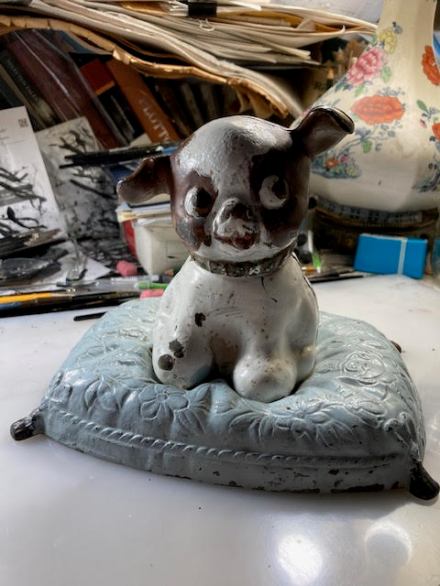 He is the product of Hubley, the early manufacturer of cast iron bank and doorstop fame, founded in 1909, and his brethren and tracks about them were surprisingly easy to find online. I did fail however to find him precisely. The earliest version of this bank I found was back in 1914, another slight design change is evident in one from the ’30’s. Originally sold under the name Puppo in the teens and s/he was designed by Grace Gebbie Drayton. (On his light blue cushion it is a he for me but interestingly always referred to as she in the online listings and information.)