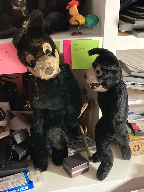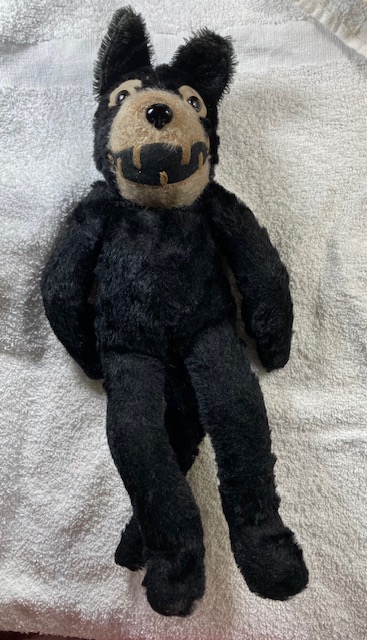 Chad Valley is a British toy company that dates back to the early 19th century. They were makers of teddy bears in the early part of the 20th century and that’s when and how the Felix-es must have snuck into production. They subsequently became better known for trucks and tin toys over time. A google search turns up many different styles of Felix which are assigned to them as a maker, but very little help in detailed identification. (I have done a better job of identifying my Bonzo dog and an Ooloo the Cat as Chad Valley and those posts can be found here and here.)