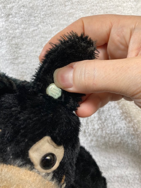Our Felix is a solidly made toy and his previous father, Peter, told me he is by the maker Chad Valley and upon careful examination – yes! He has a Chad Valley button tucked into his ear.