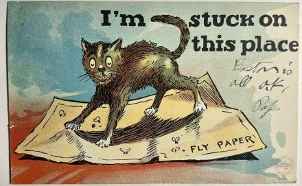 Still, even in my lifetime the prevalence of the curling amber strip of sticky plastic hanging from a ceiling has almost, but not quite ceased to exist entirely. I was genuinely horrified by the sight of them as a child. They seemed malevolent although I do not profess an affection for our friend the fly. Meanwhile, poor kitty! It would be truly terrible to be stuck this way, on an imaginary and outsized piece of the stuff.