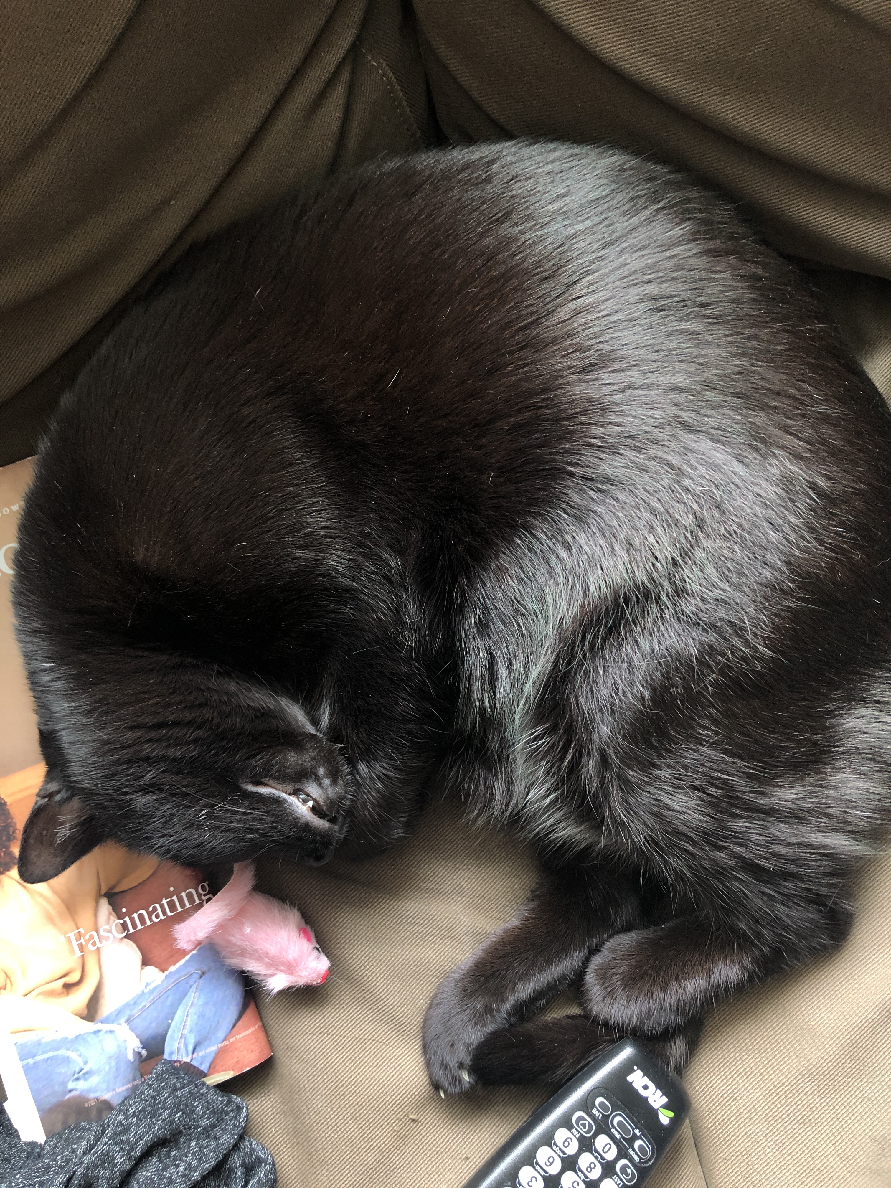 After couch time with us he retired to bed with Kim and spent the entire night tucked and purring, between us (moving to occasionally perch on top of one of us) much as he had nine years ago on the day we got him. After a day of his hiding in a scary new place I woke to find a tiny kitten Blackie sound asleep between us in the middle of the night. Last night his little engine went purr all night, rising occasional and then falling to a reassuring rumble.
