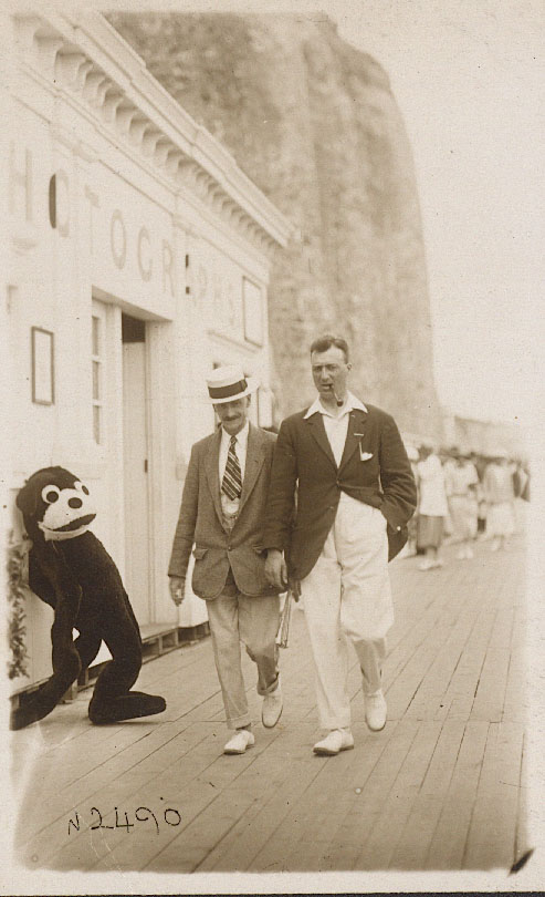 The more recently purchased photo is smaller in proportion by several inches, 4″x5″ rather than 5″x7″. I wonder if their tracking number at the lower left is truly chronological – N5252 and N7130 – which would make the triplets the later one. (And the gentlemen in front of the photo establishment much earlier than either.) Presumably these numbers, which appear in some form on all these sort of day at the beach posing photos, were used to tie out the negative to the appropriate party so the photo could be sent to the correct person. Unlike tintypes, which were usually developed in real time in a soupy bath of hypo, I have always assumed that developing and printing the postcards took at least a nominally longer time.