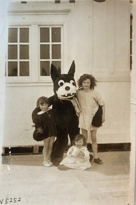This is an especially wonderful Felix they are posing with here – big enough to be a small person in a costume. (The first time I saw one of these cards I thought that might be possible!) He has very nice, big, pointy ears and was designed with extra long arms which he wraps around the two little girls, very chummy! His bow is untied and a tad bedraggled, and admittedly there is something particularly buck-tooth about his usual sewn-on toothy grin.