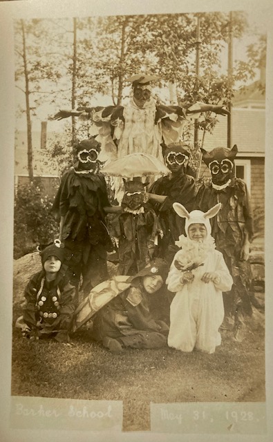 Pam’s Pictorama.com: even by my standards this is a pretty goofy photo. Extremely faded at the bottom left it says, Barker School and on the other sidebarely legible, May 31, 1928. Written on the back in pencil is Woodland, Maine and Halloween Costumes – which clearly they are not since we know it was taken in May.