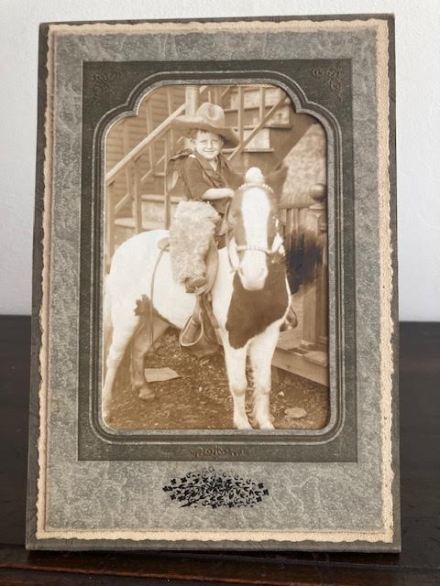 Huge cowboy hat (a ten gallon hat on a five gallon size head?) atop his head, this young’un is decked out from head to toe with a kerchief and chaps, down to his tiny riding boots. On careful examination there are stirrups that hang down for decoration or use by a larger person and our pint-sized cowboy has his boots tucked into smaller, shorter ones.