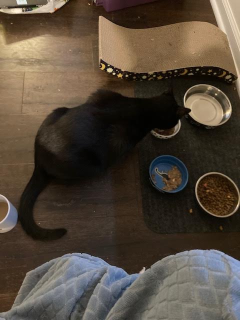 In wrapping this post, I will report that this morning, as I waffled on whether or not I needed to hand feed Blackie so he could get a shot of insulin, he marched over to his dish like a regular fellow and ate some breakfast. I would say he and Cookie are not quite up to their usual consumption but both are eating out of dishes, a bit more dry food than usual, but in approved normal fashion. Whew. Now they are starting to eye the threshold of the bedroom and what is beyond. I’m sure there’s more to come!