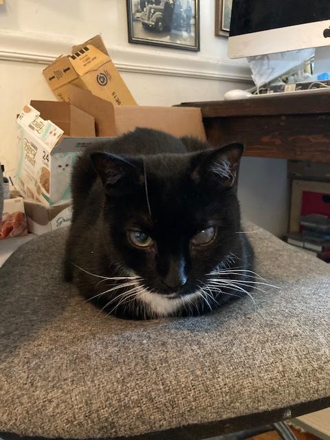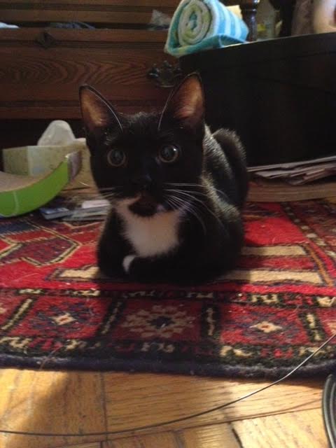 Our Blackie, all black except for a white spot on his chest, like a badge, is a not quite tux to Cookie’s tux-ness. (He has white underpinnings too but you need to know him well to see those.)