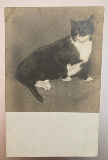Pam’s Pictorama Photo Post: I have always been partial to tuxedo cats. There were several prior to Cookie who is the current puss to claim that title here at Deitch Studio. This old photo postcard came in over the transom recently. It was never mailed and there is nothing written on the back. I think there is something very sincere about it – not a great photo but perhaps a beloved one. It is unclear to me what kitty is perched on but it creates a seamless background.