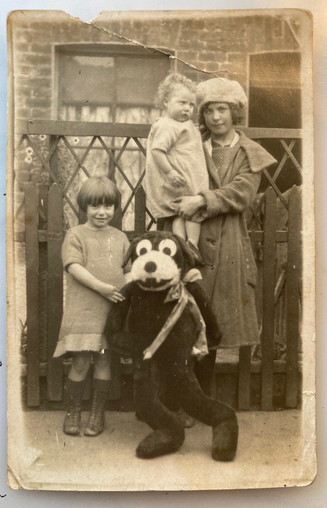I don’t recognize the location and don’t know what seaside town in Great Britain this was taken in, almost looks like more of a park. The scruffy vegetation and the stony wall do put me in mind of being near the ocean. However, the men walking behind Felix and child are in dark suits and hats – not exactly beach-y attire, perhaps an important gathering of corporate tycoons? A Davos of the day?