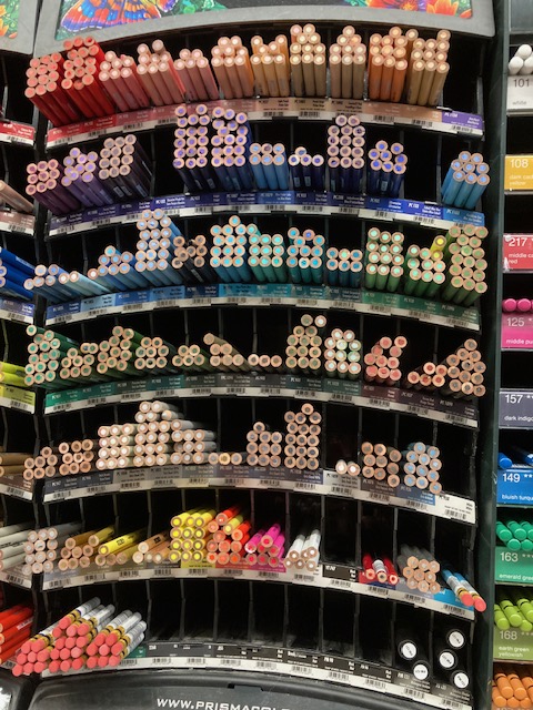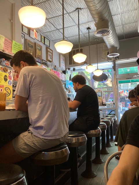 So visits to Eighth Street have become a routine part of our lives. Kim brings a book to read while I do my eyeglass business. It is followed, generally, by a bulk buy of coffee from the place next door (Puerto Rico Import) and maybe Blick for Kim to get art supplies. Lunch is usually pierogi at a Polish restaurant, although yesterday it was messy veggie burgers at H&M Dairy.