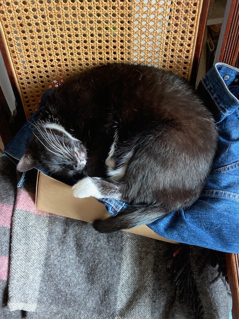 Cookie napping recently. I must say, she doesn’t seem concerned about Blackie but is happy about all the treats in the house.