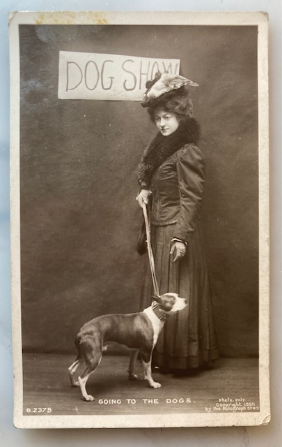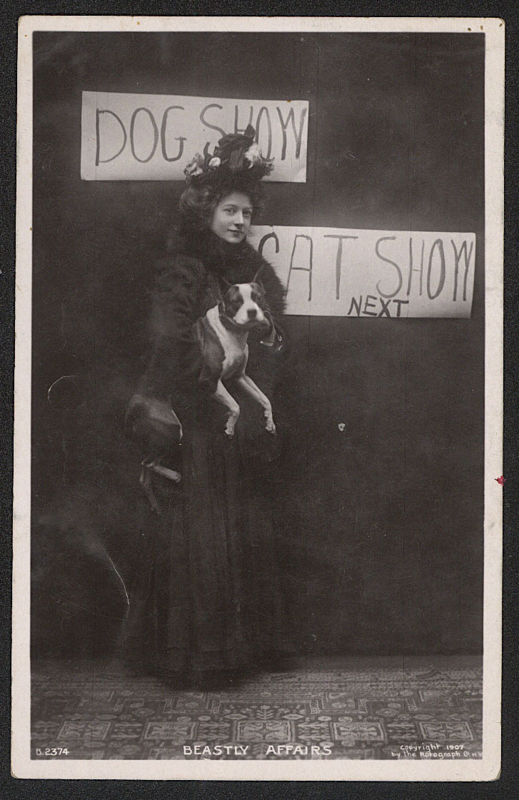 While these two cards are definitely of a piece, the Dog Show sign is definitely the same, there are some differences. While I am fairly certain this is the same woman and dog (same Dog Show sign) she is wearing a different outfit in each. The Cat Show Next card is entitled Beastly Affairs.