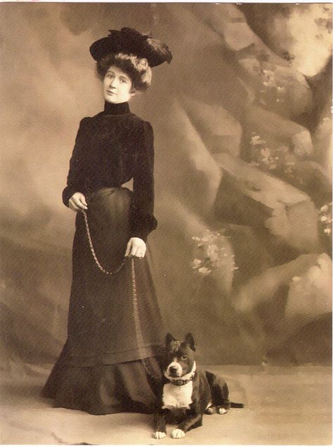 I prefer the earlier card somewhat and it is more than the cat show reference. The composition with the additional sign is a bit better and somehow holding the dog, and even the patterned floor, make it more dynamic. She has a bit of a smile in the first shot and a hat full of flowers – the hat in today’s card notably appears to have a whole bird on it. She wears a different fur trimmed jacket in both.