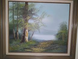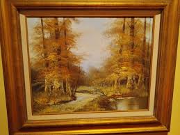 None of his other paintings seem to have an interesting homemade frame like mine which definitely adds to its appeal. (Actually, hard to see but the second painting of the two above might have one but I can’t quite make it out.) It does leave me wondering a bit if he made it or someone else but it seems to be so much a part of it that I defer to thinking it was him. The painting is on masonite board, not especially heavy, even with this frame. For me this painting is mostly about these hogs, although for Kim it is, in part, the painting of the foliage which seems to be something he did employ and excel at. The composition, with the winding path and the light hitting the trees, is strong too.