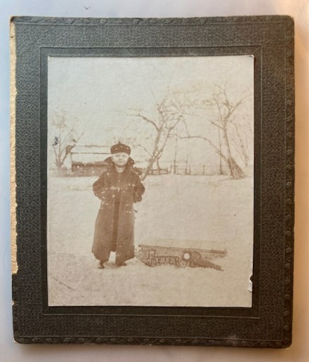 Mounted and undated, other than a bit of damage at its edges it is in good shape. It seems it was a treasured photo despite it being overexposed, although somehow it works with the effect of the snow. This little boy is wearing the kind of long coat I think of more for an adult, but I guess he maneuvered on his sled just find nonetheless. (I bought a very long down coat this year to replace one I have been wearing for decades. It has zippers in the side so I can actually walk in it or keep it zipped all around in terrible cold. I can’t image it on a sled though.) He wears a cheery sort of beret and sort of has the look of a race car driver standing next to his beloved vehicle which is why I purchased it.