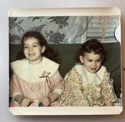 The other photo (they were sort of stuffed together in a bit of plastic when I found them) is early color and is Easter Sunday 1966, two years later. My sister, in the pink, and I are clad in unlikely dresses for the holiday. I suspect they were gifts from my grandmother – I almost wonder if she made them but probably not. Our normal attire ran to the indestructible but were were clearly meant to be memorialized on this occasion as properly dressed little girls.