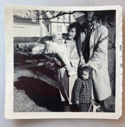 The black and white photo is my mom and dad and sister Loren. I am the babe in arms and according to the date on this, November 1964, I am 9 months old. It was taken in front of my maternal grandmother’s home, with the camera facing away from the house. (I wrote a long early post about my grandmother’s house and it is here.) My apologies to my brother Edward but these were take several years before he was born.
