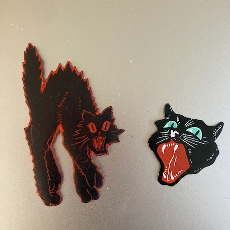 It is my intention to have him join another Halloween cat which has graced my office for many decades. I was working at the Met and I don’t remember how this couple knew that I collected black cat items, but they made a gift of it to me one day. Seems their son was a buyer working for Martha Stewart and was responsible for sourcing decorative items for the various holidays which would then be shown in the magazine and probably also sold under her brand. This cat had been a sample among the items he proposed and it was rejected. Somehow his parents saw it and grabbed it up for me.