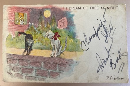 Pam’s Pictorama Post: While my timing may miss the mark for Halloween this year, the subject matter in a sense is pure Pictorama. The cat in question showed up from an auction house on Halloween night, having been purchased at an online auction a few months ago. While most auction houses I have encountered actually get items to me very quickly (one called Everything but the House sends out their packages with startling efficiency seeming to arrive within days) clearly some are more pokey. I purchased two things recently, at different auctions, and they have slowly meandered in a few months later. They are both welcome additions and today we start with this kitty – the other is a rather great future post.