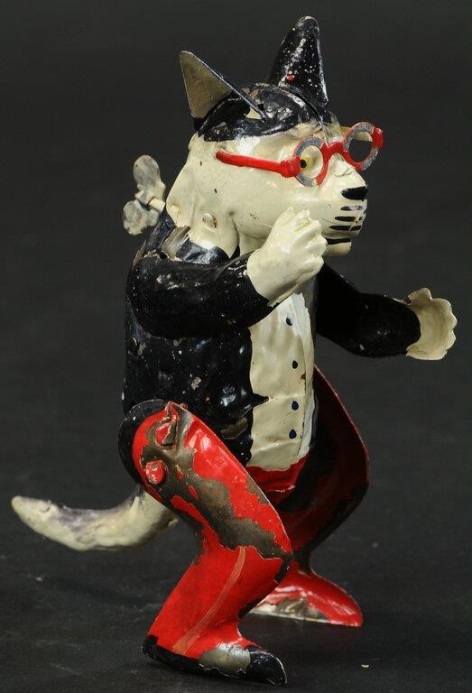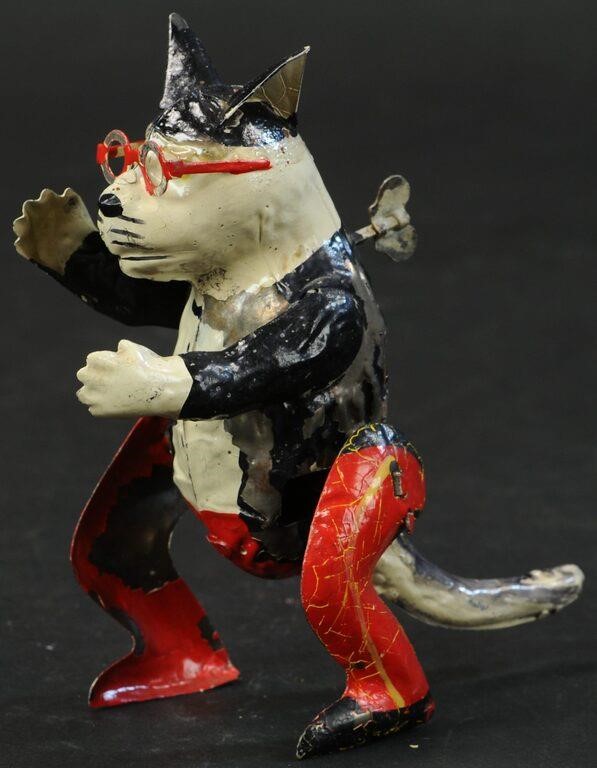 Above is my own early (albeit beat-up) version of the Gunthermann walking Felix which I wrote about previously in a post found here. Also shown below is the more common version of the same toy pattern. The obvious question is, why did someone decide to disguise Felix in eyeglasses and a cheery black, red and white suit? How many could have been made and sold and why take a popular character make a very popular toy of him and then change it up? His red glasses taking the place of the black circles around Felix’s eyes. Mine wears a nifty white vest with painted buttons, white gloved hands and red trousers (with a pinstripe!) that end in black spats – his tail is painted white.