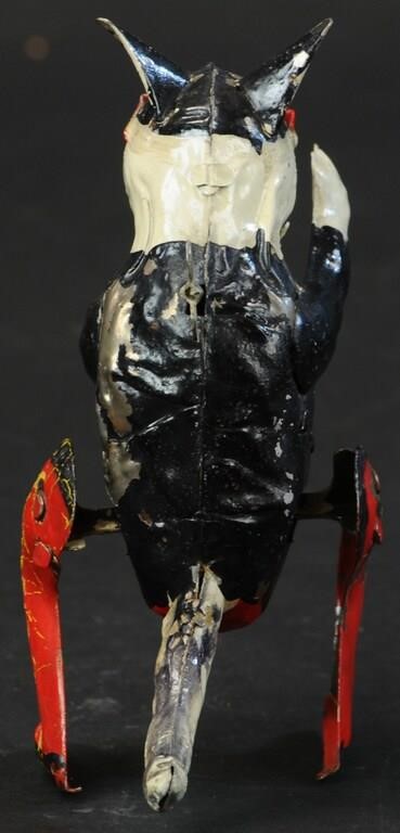 His trick, as you can see, is that when wound his tail spins around – a fairly straightforward motion. Further research shows that he originally had a shoe in his mouth! When I looked, sure enough there is a little hook in the corner of his mouth to hang it from. Ha! It does crack me up. (The concept and the motion is similar to another tin dog in my collection, shown above. A post can be found here complete with video motion. There is also another tin dog that coughs up tiny balls which can be found here. You see, we do have our dog days here at Deitch Studio.)