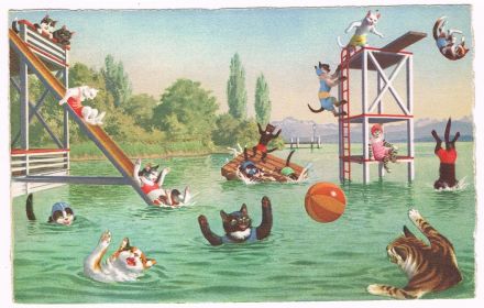 Today’s card was purchased by me early in the show as I made my way through each dealer; it is Mainzer at his best. I have written about Mainzer before (which can be read here and here) who is sort of the later heir to the Louis Wain throne. Mainzer, as a card producer, picks up that ball in 1938 and runs with it, arguably until at least 2005 when taking the reprints of the cards into consideration. Prior to 1955 the production address was 118 East 28th Street here in New York. (On a whim I did a Google Search on the address and it is worth a look, the Kaime Arcade building with a very interesting facade.) After 1955 it is just noted as Long Island City and that is what is printed on this card. Eugen Hartung was the artist.