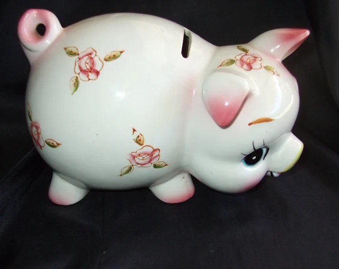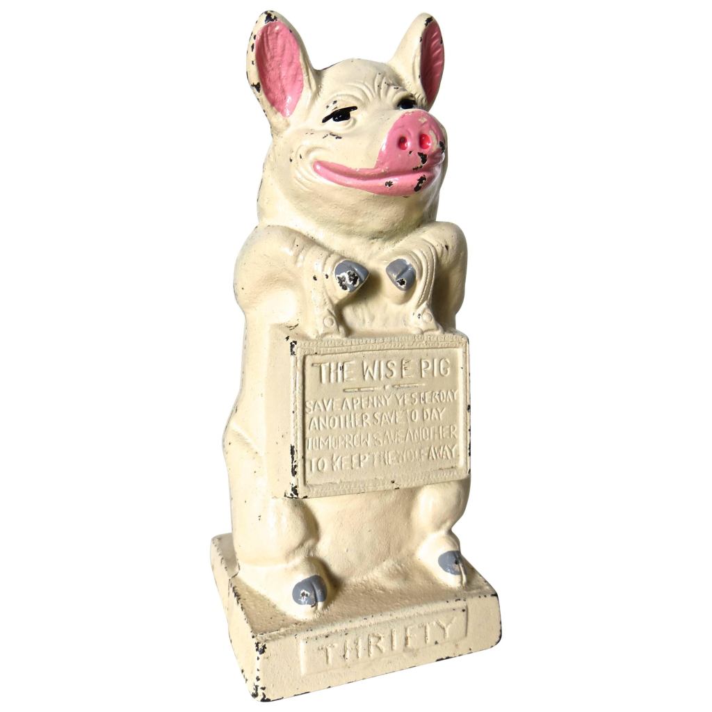 As for this bank, it stands at five or six inches. A trace of paint remains on the face and hands while the red tie remains fairly vivid. This seems to be the most common form of this bank although online I found versions in an overall green and one in red which I can’t decide if it is original or not. The face was the first to go and I can’t say I found it pristine on any of this design. Buster’s hair was painted a light brown and Tige’s mouth was also the vivid red and there were red circles around his eyes.