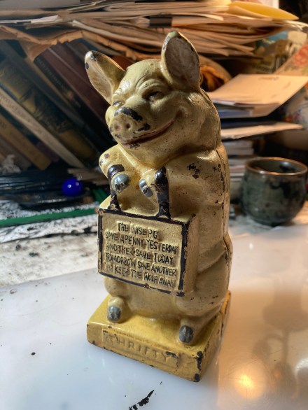 It is a simple bank with a screw in the bottom you would use to retrieve your saved coins. It is small so not like you were keeping a fortune in there. Kim starts to ruminate on restoring it as soon as he looks at it. Evidently it makes him itch to paint it although we know that he won’t – nor should he devote time to such projects when more creative work awaits him. (Although Kim’s next book is scheduled for release early next year he’s already deep into the one after it.)
