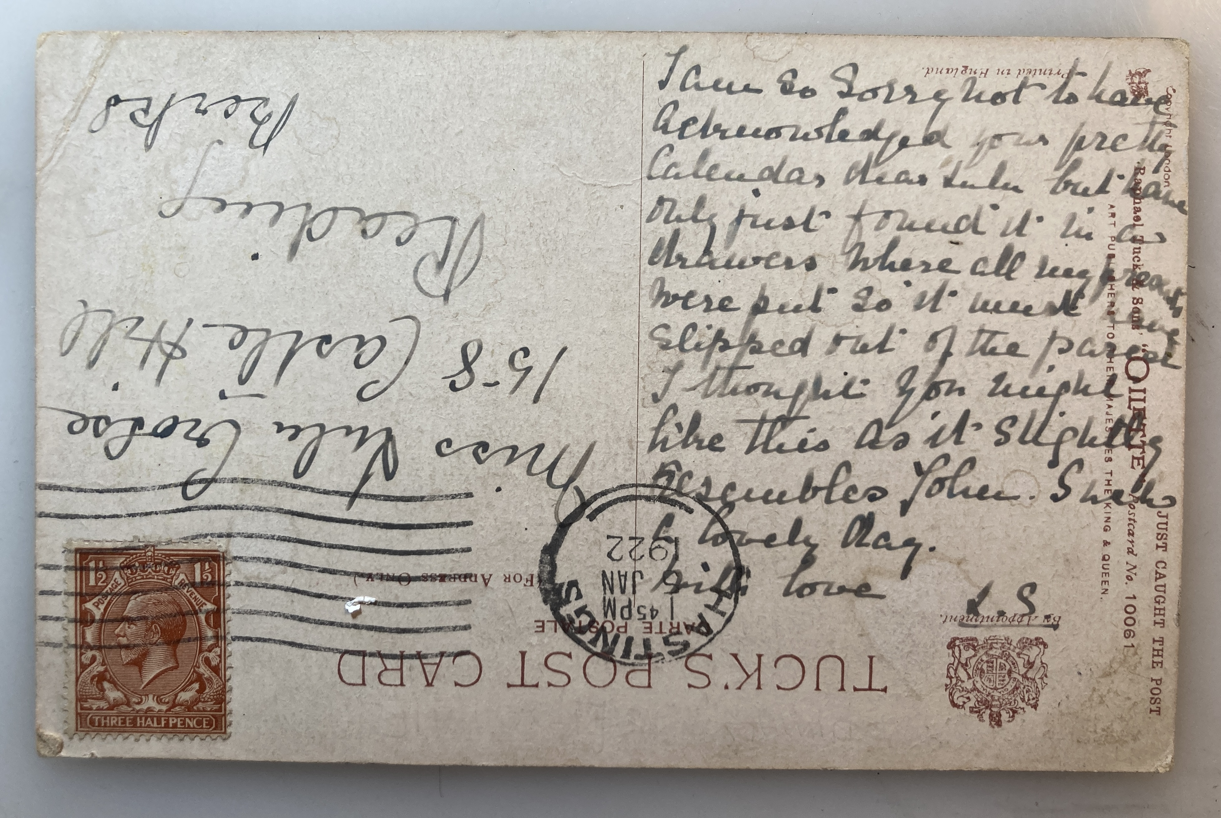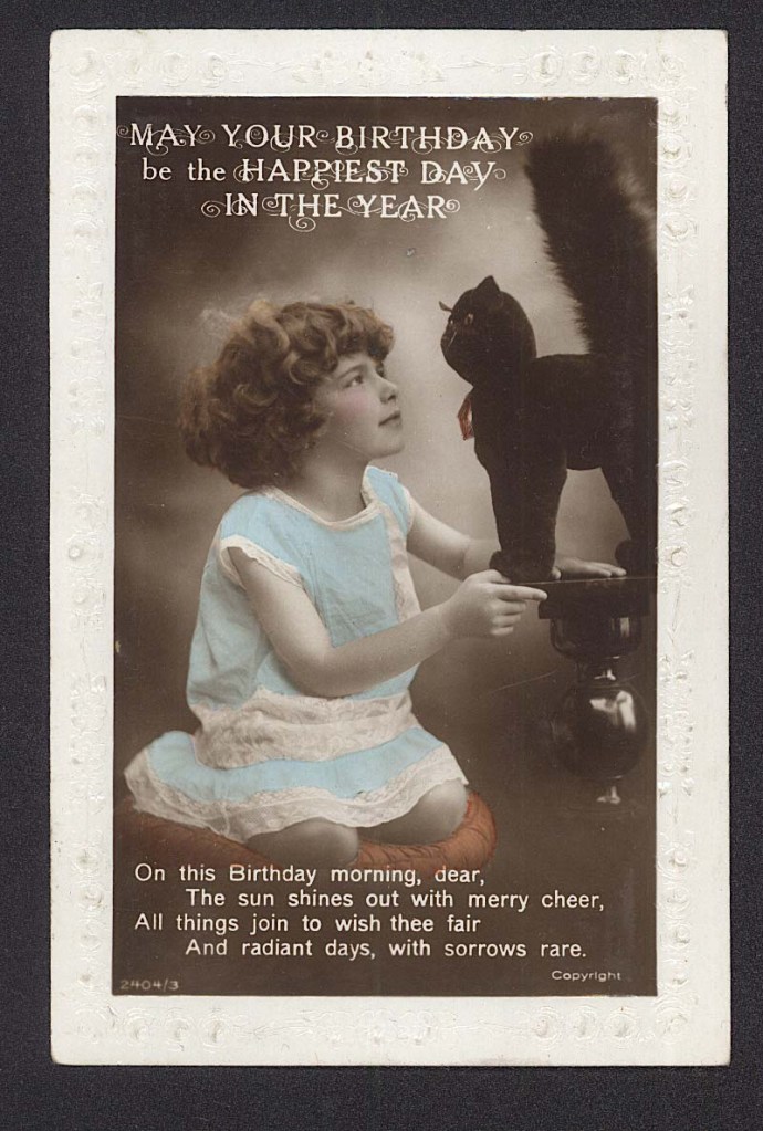 This card was never used and is attributed to the Alphalsa Publishing Company in London. This company seems to have existed, under shifting names, between 1910 and 1930, although there is an intimation that the archive from it existed into the 1960’s when it was lost in a fire. The back of the card also identifies it as The Aloha Postcard. Louis Wain and Alpha get credit on the bottom front of this card.
