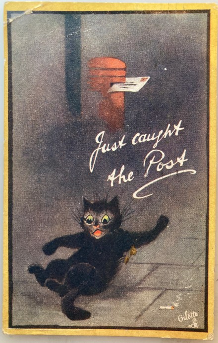 Pam’s Pictorama Post: Today I have a somewhat odd Louis Wain card which I have to assume is an early one, before he found his feline métier in the more satirical and representational vision of cats. This black one is loaded up with symbols of luck – a black cat being lucky in Great Britain, if not here in the US. (Proving them to be sensible sorts in this regard – in my opinion!)