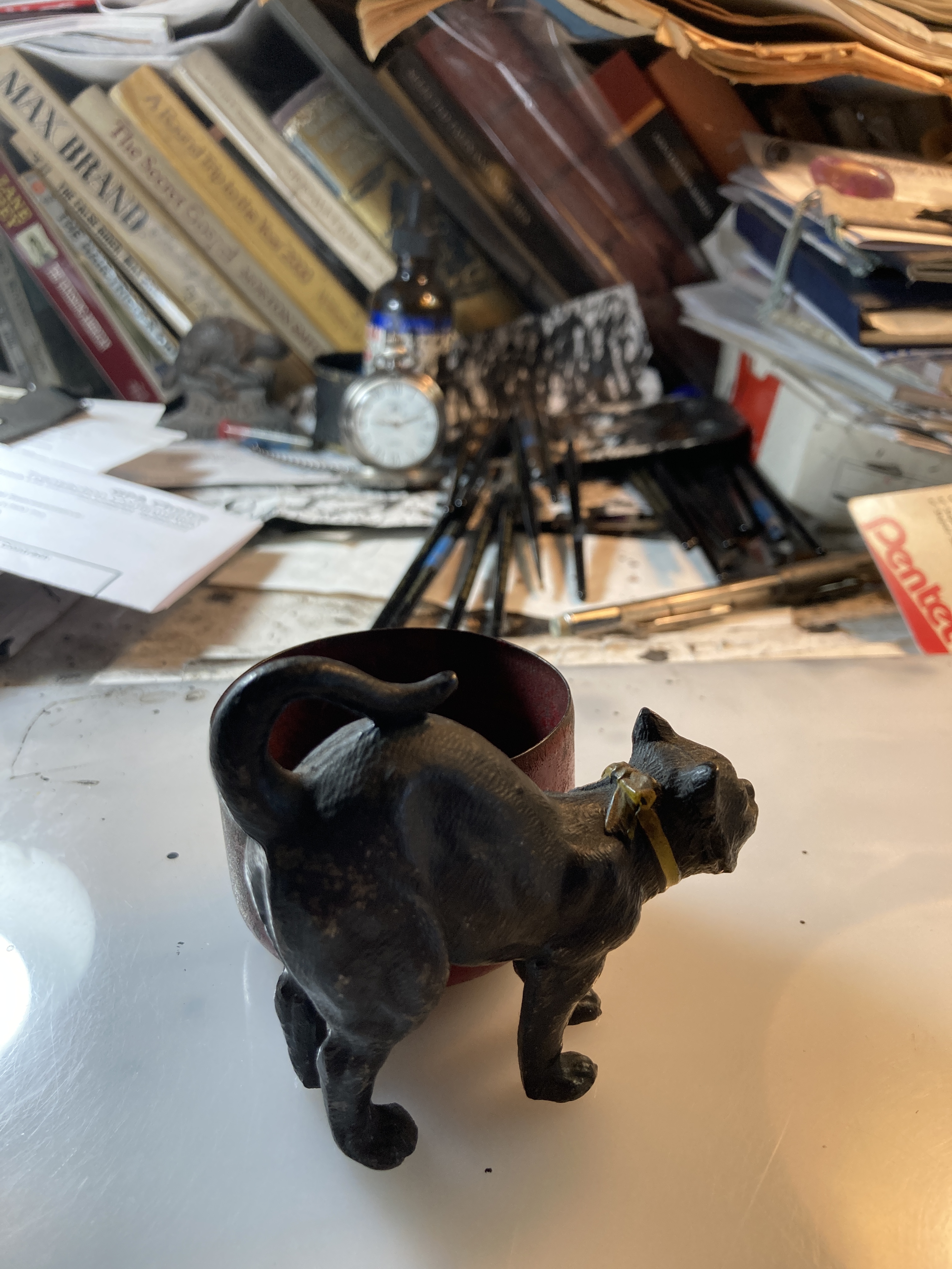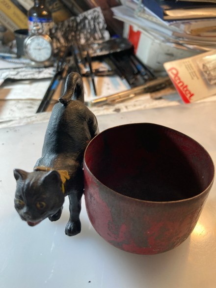This nifty black cat stands by a pot which I believe was designed to hold the spent matches more than those awaiting use, although I guess you could have gone either way. It entered Deitch Studio earlier this week from Great Britain. I was in East Hampton for work on Fourth of July weekend when I noticed it in an idle IG scroll of a jewelry account I frequent, @therubyfoxes. I was in the middle of too much to execute the purchase and asked Mia to hold it for me and I was pleased to buy it later – and even happier with it when it arrived.