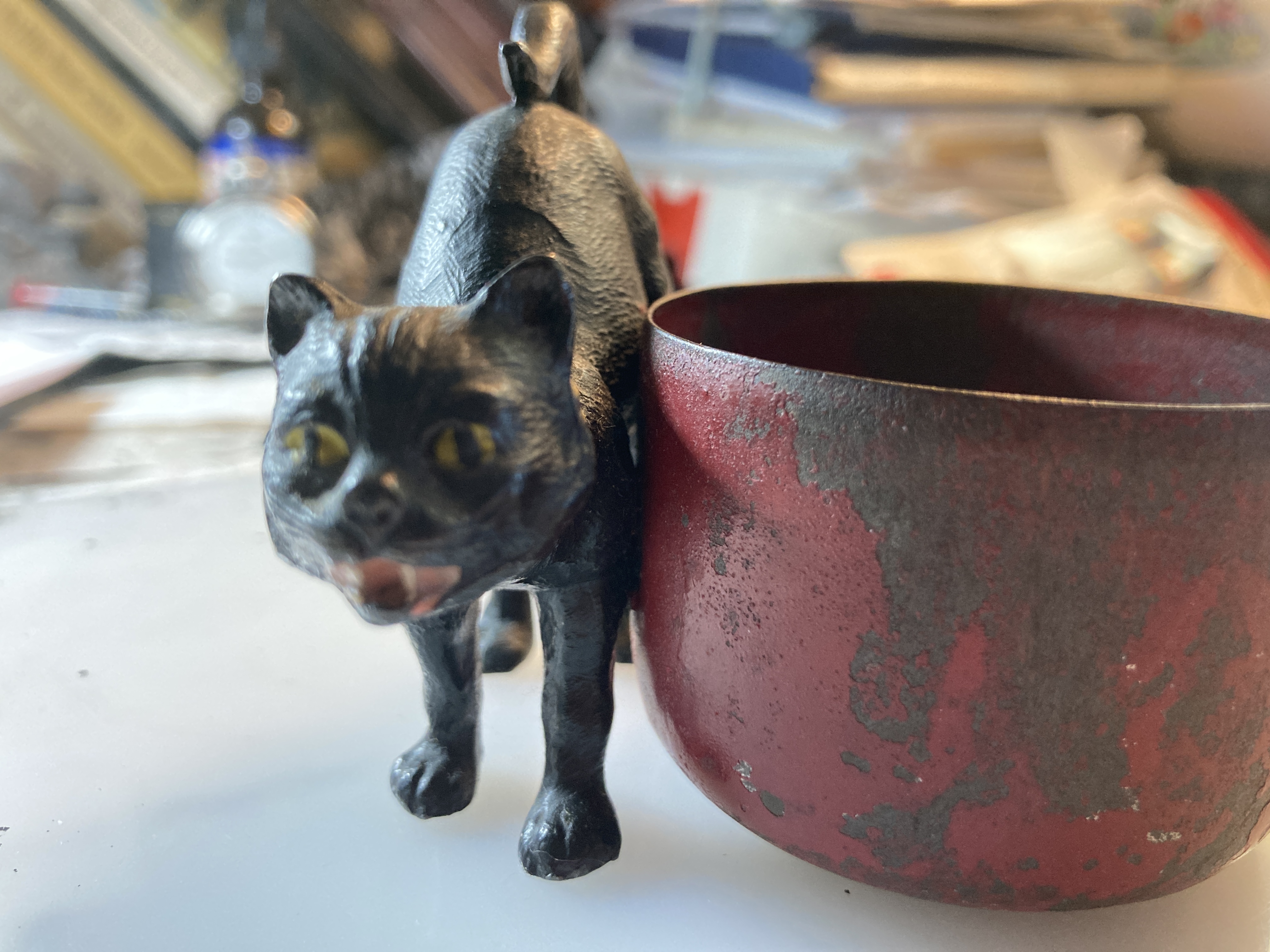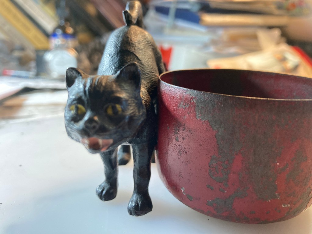 It shows pleasant signs of some wear from years of use and probably sitting near a stove. I would describe it as being made of pot metal. Meanwhile, it’s a fang-y black cat if you look carefully, exclaiming for attention, mouth open. He or she sports a yellow bow around the neck. Kitty’s back is arched, although not really threatening, and tail is looped over on his or her back.