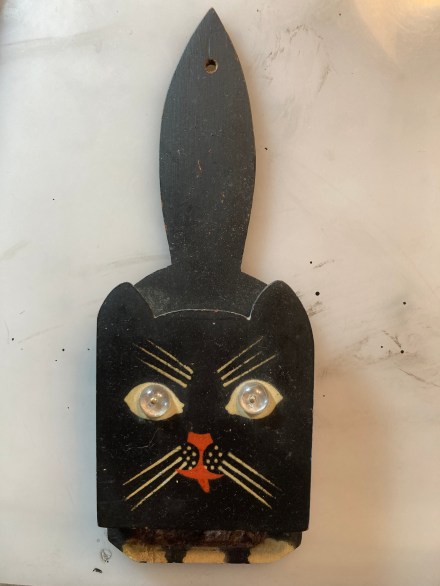 His tail, now gone, seems to have been a victim of persistent pulling over the years, and his back is marked with the residue of scotch taping. He has a bit of ancient string on his head where he hung from. I think the very first year I moved into this apartment I may have put him on the door, but now he resides comfortably on a shelf, tucked near yesterday’s feature coincidentally, my Oswald Rabbit. There are a few others scattered around him, a good cardboard black cat head or two.