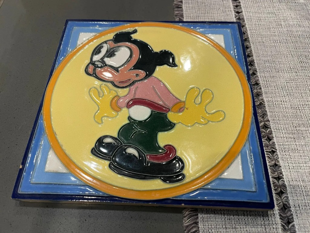 One other cartoon tile was being sold and I am sorry I didn’t try to snatch it up, but I got so confused by this one being pulled off I lost my focus. It is below and sold for about the same price. This one (is it Betty Boop’s sidekick Bimbo?) was identified as being from Mission Art Tile California. I can’t really find tracks on that either however. It appears to be in similar mint condition.