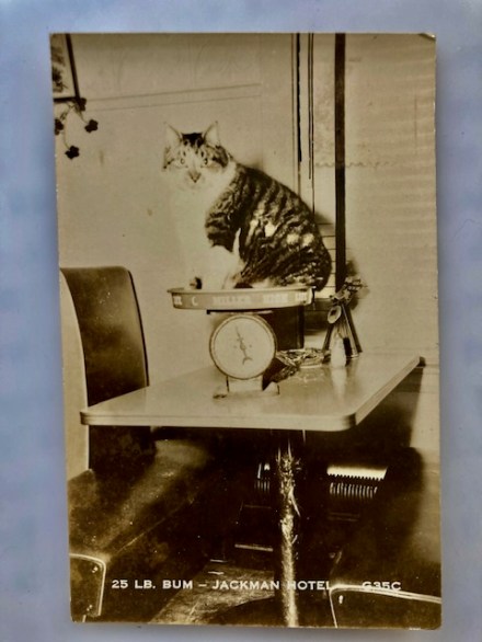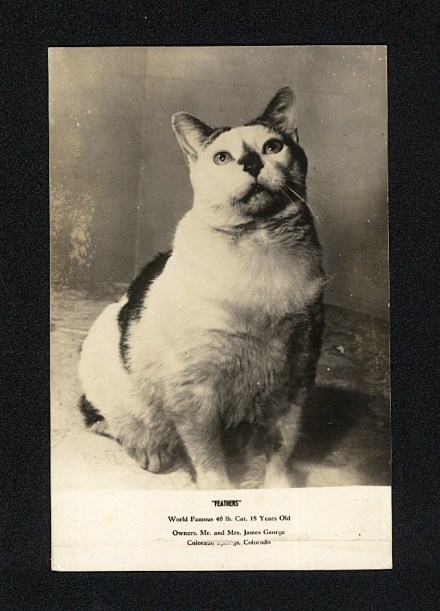 Fat cats and recording their enormity is a sub-genre of cat photos in its own right. I have two in my collection I have written about previously, A Cat Named Boy (with the post which can be read here) and Feathers about whom a 2016 post can be read here. Meanwhile, Feathers claimed to be world famous and weighed in at an amazing 40 lbs!