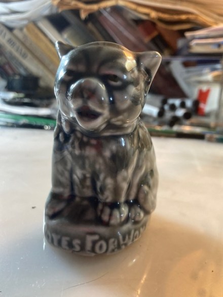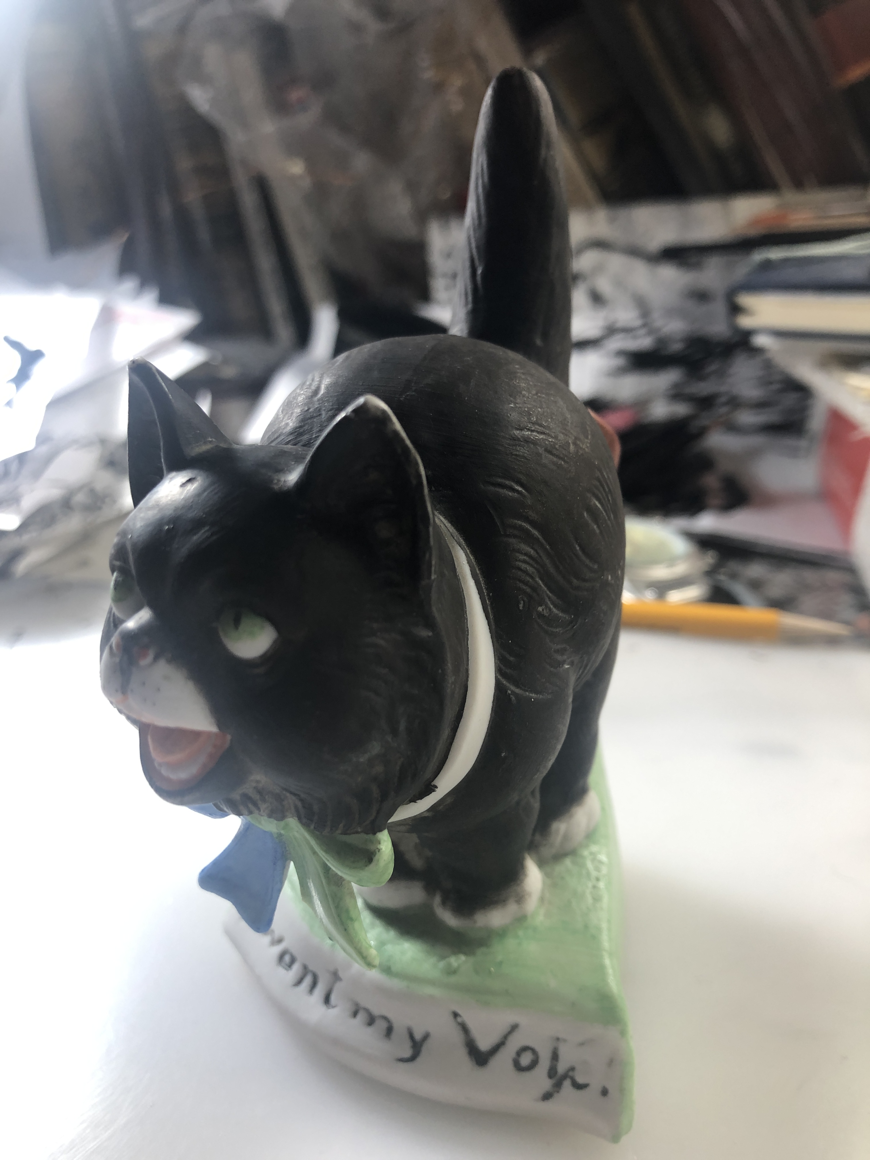 In learning about this I was of course interested to find that cats, often black cats, were the face of the movement. I wrote about this at some length in another 2021 post when I acquired my first ceramic, I Want My Vote black cat statue. Purchased from a Hake’s auction, I stumbled upon it and its history. (That post can be found here.) There was a double edge sword to the symbolism – those against suffrage meaning if you let women vote men will be stuck home with the home with the family cat, that women would wear the pants in the family.