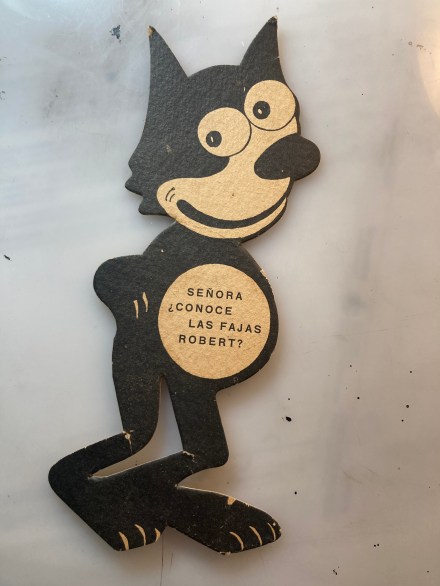 He’s about eight inches high and made of a medium weight cardboard. There are no marks or indications that he would have hung somewhere, nor a way for him to stand so I guess these were just hand outs. He is a bit large as calling cards go though, but despite some fold marks on his legs he survives in good condition. Someone tucked him away safely and we will assume it was his Felix-y charm, not the need to remember where to get a good girdle.