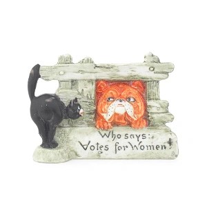 She’s about three inches high and Votes for Women is across the bottom. Some entries seem to find the mewing expression as a negative although in general she seems to be accepted as a pro-vote item. I have seen her in two colors, this blue and a brown. (I will note that on Worthpoint there was a two color version, the brown, but with green eyes and the mouth and ribbon in red!)