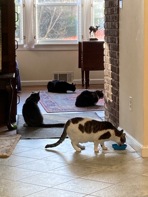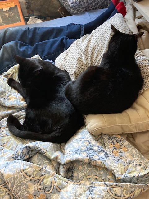 Four out of the NJ Five here – Gus missing.Blackie and Cookie peevishly sharing the bed with each other and of course Kim recently.