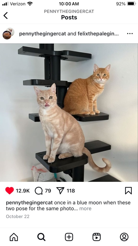 Most recently I have fallen hard for team Penny and Felix on Instagram. Penny (@pennythegingercat) is a somewhat sardonic and absolutely adorable orange tabby female (yes, a rarity) and Felix (@felixthepalegingercat) her younger brother, a lean and lanky light orange fellow. (Penny alone has upwards of 650,000 followers!)
