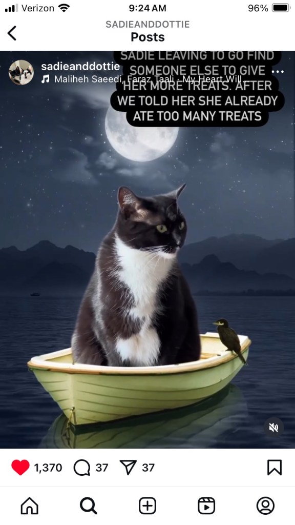 With almost 14,000 viewers cat mom Lauren Grummel and cat dad Chas Reynolds, Jr. appear to have their hands full supplying frequent doses of their kitties going through their daily paces. A favorite post is an imaginative one of Sadie (the tux) sailing away on a boat at night in search of parents who will give her more treats instead of telling her she’s had enough. (Find it here.)