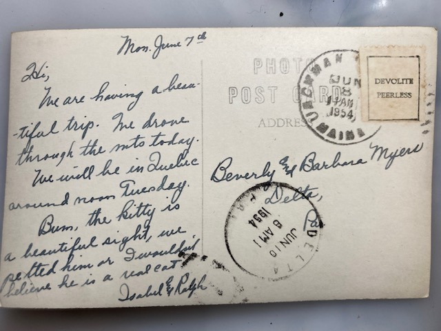 This postcard was send on June 8, 1954 to Beverly and Barbara Meyers whose address was quite simply Delta, Pa. We know it arrived the morning of June 10 as far as Delta as it is stamped there as well. It says, Mon. June 7th, Hi, We are having a beautiful trip. We drove through the mts today. We will be in Quebec around noon Tuesday. Bum, the kitty is a beautiful sight, we petted him or I wouldn’t believe he is a real cat. Isabel and Ralph. I am glad they recorded having giving him a few pets! As hotel mascot, and in deference to his weight, we’ll assume he lived a pretty good life as the feline denizen of the hotel.