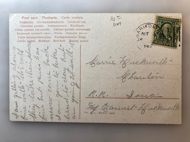 A simple message in script is written on the back, Tell father that the package was received last evening. I’m getting along nicely. Auntie Jean. It was mailed to, Master Wm. B. Rankin, Tenafly, NJ box 1540. It was mailed from East Wyndham, NY on August 6, 1907. East Wyndham appears to be an enclave in the Catskills, north of Kingston. The back of the card confirms that it was is No. 2000 Published by Albert Hahn, 229 B’way, N.Y., Germany.